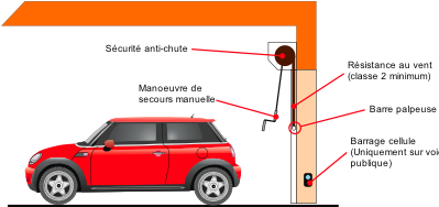 • Une barre palpeuse : un boudin caoutchouc est fixé sur la lame finale du tablier,  et lorsque celui-ci rencontre un obstacle, un dispositif de sécurité stoppe immédiatement le mouvement de la porte pour la faire remonter